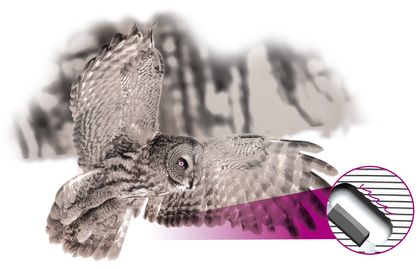 Their sophisticated feather structures allow them to fly almost noiselessly so that they do not startle their prey. Most of the noise is generated by turbulences at the rear edge of the wing. The “owl wing” concept smooths the air flow by means of the serrated edge and scatters noise, which allows nearly noiseless flight characteristics without having a negative effect on the aerodynamics.