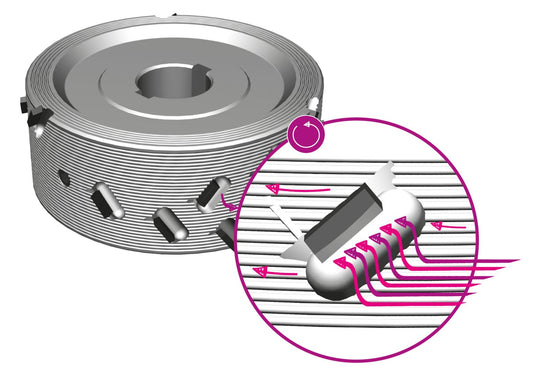 - The technical surface has been consistently implemented; therefore, the studs behind the edge are no longer required. A stable tungsten carbide supporting plate provides the required stability. The air flow can be channeled more optimally.